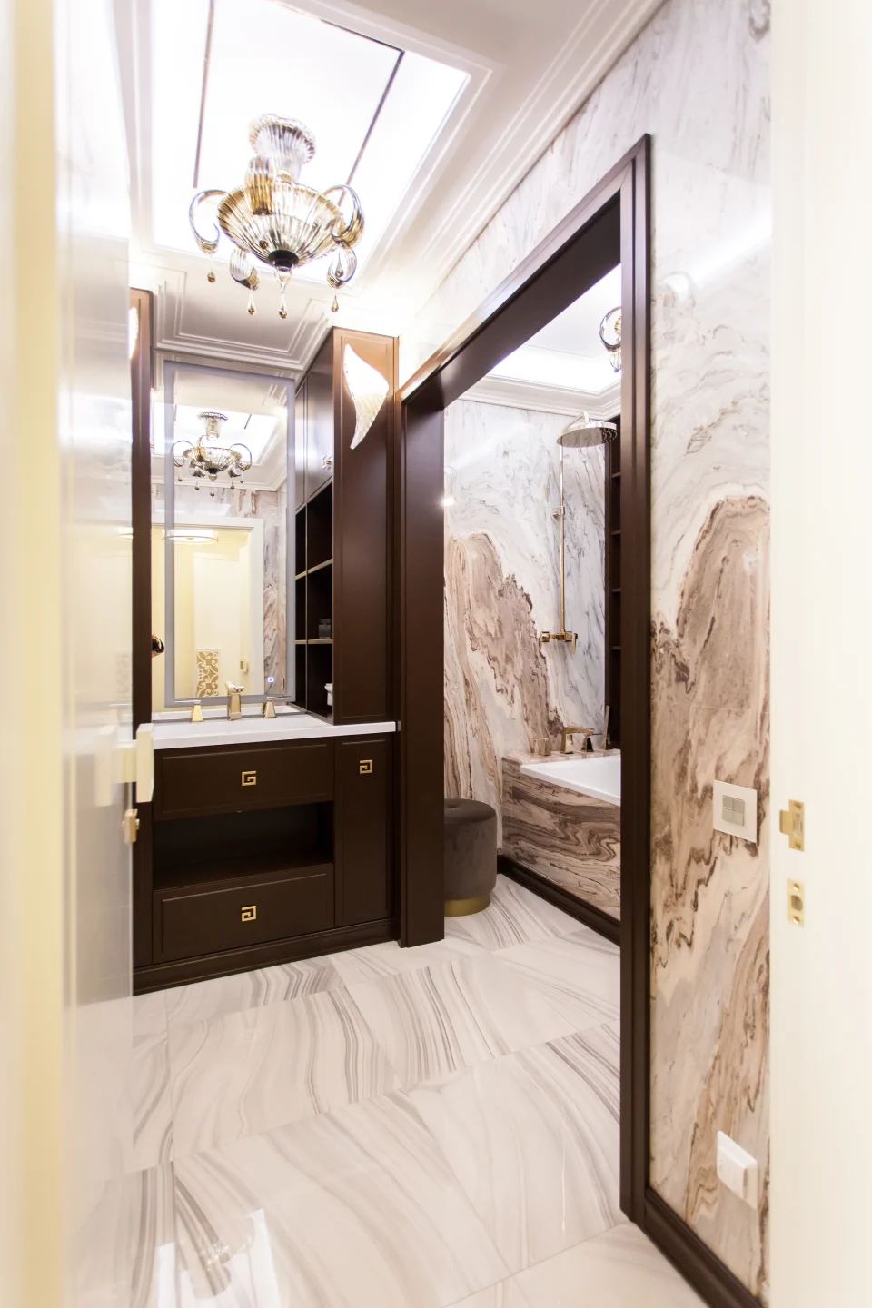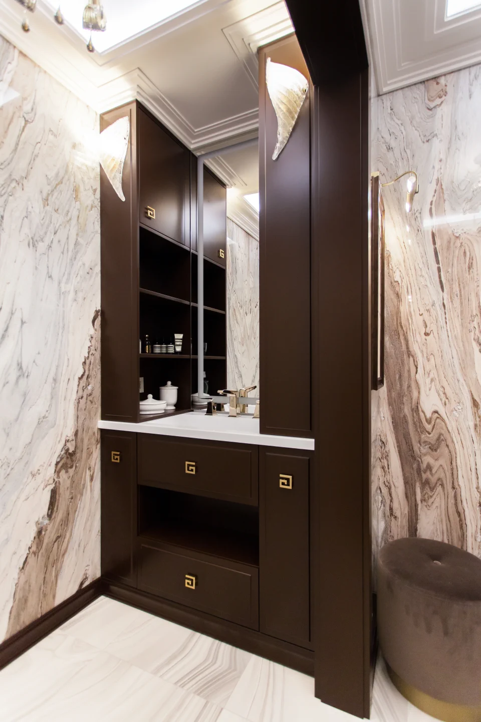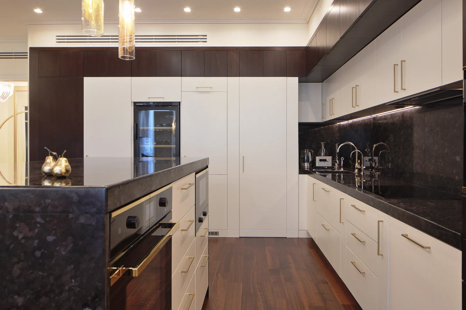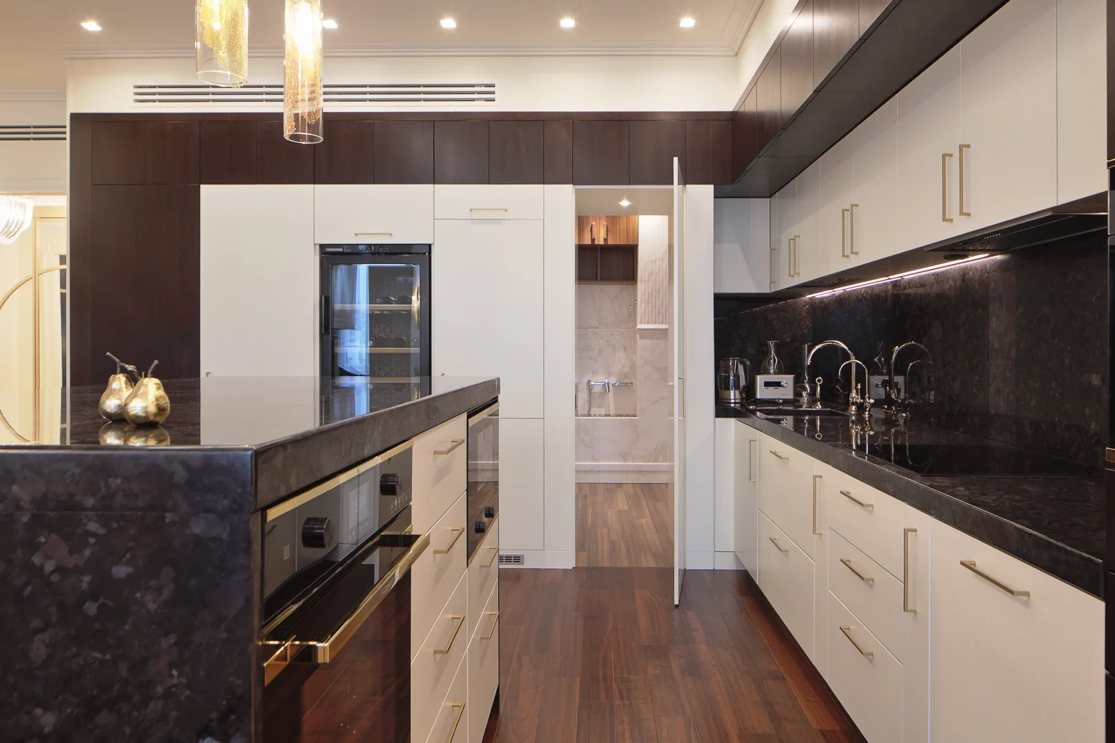 Почти все интерьерные элементы были выполнены компанией Lumi по дизайнерским эскизам. Это и великолепная кухня с островом и потайной кладовой, и гардеробная со множеством приспособлений для хранения вещей, и стеновые панели в гостиной и спальне, все встроенные шкафы и комоды, мебель для ванной комнаты.
