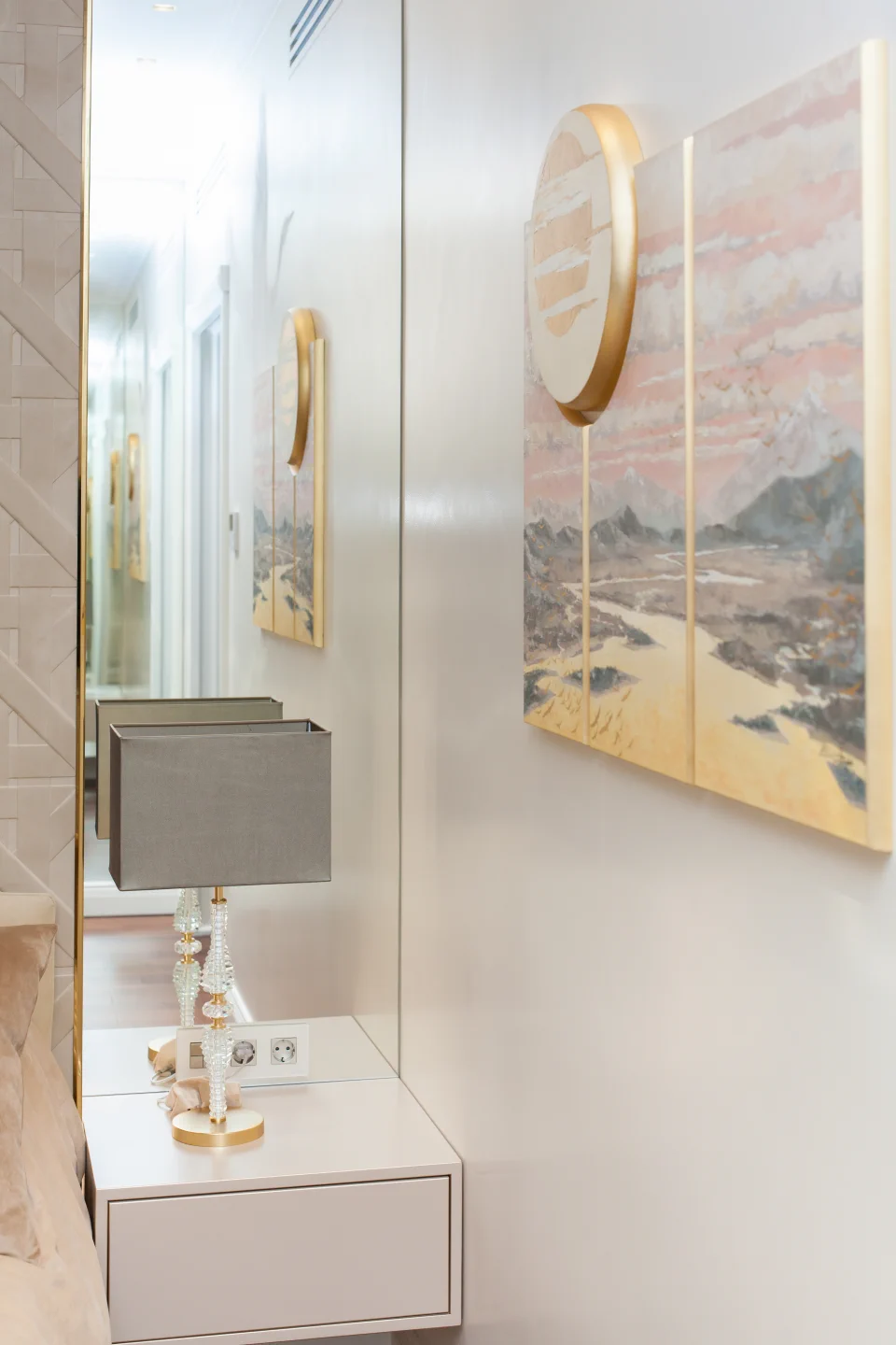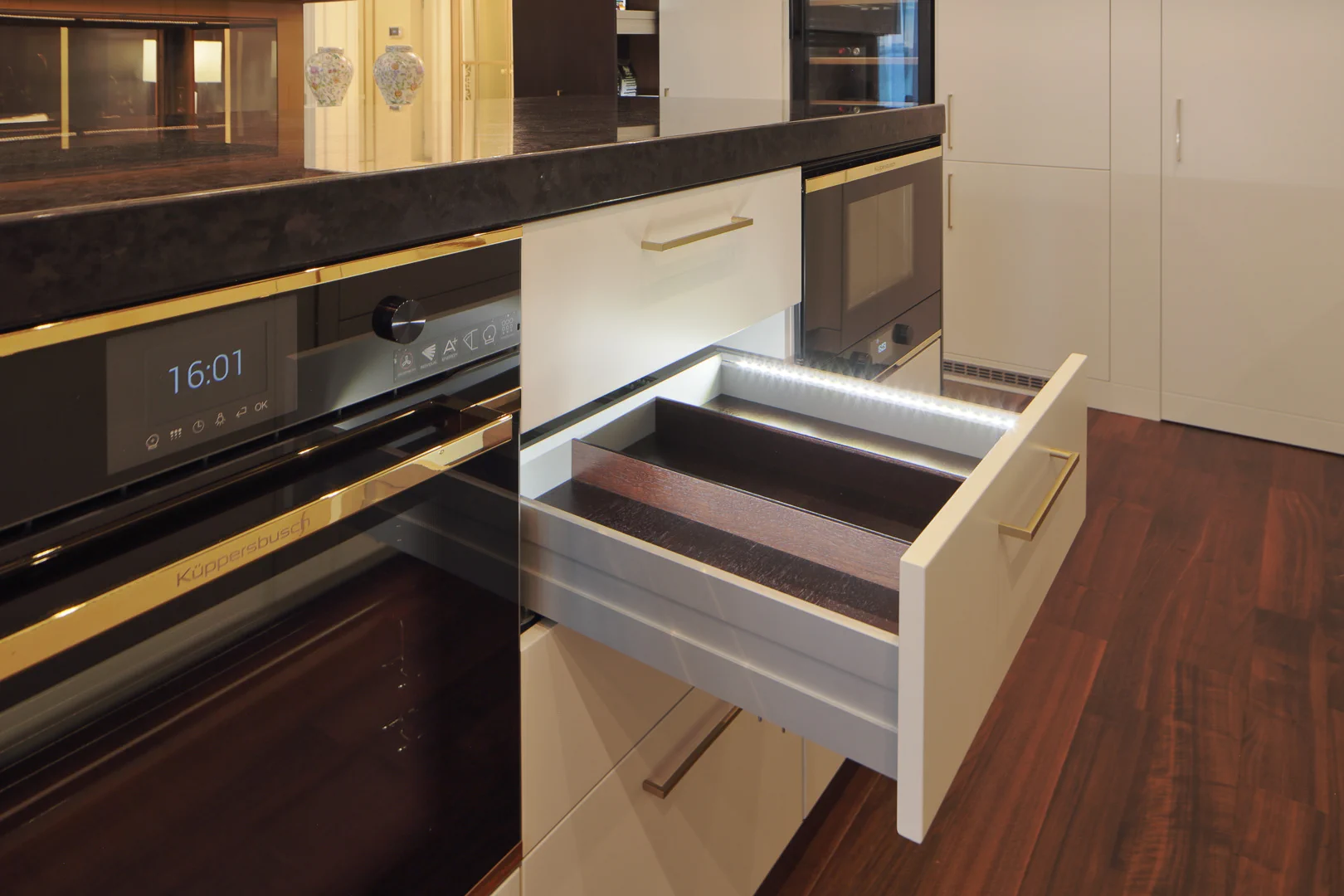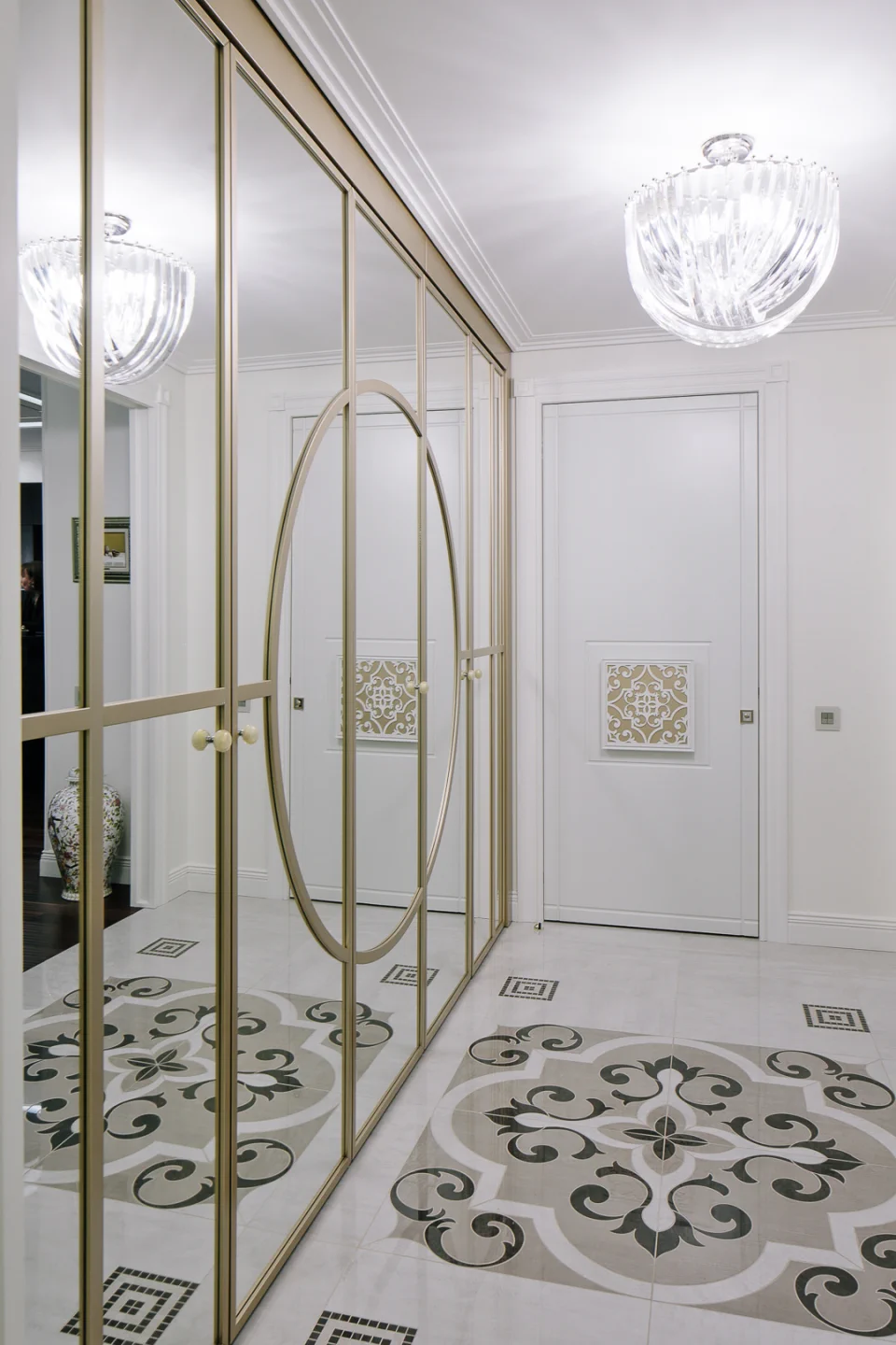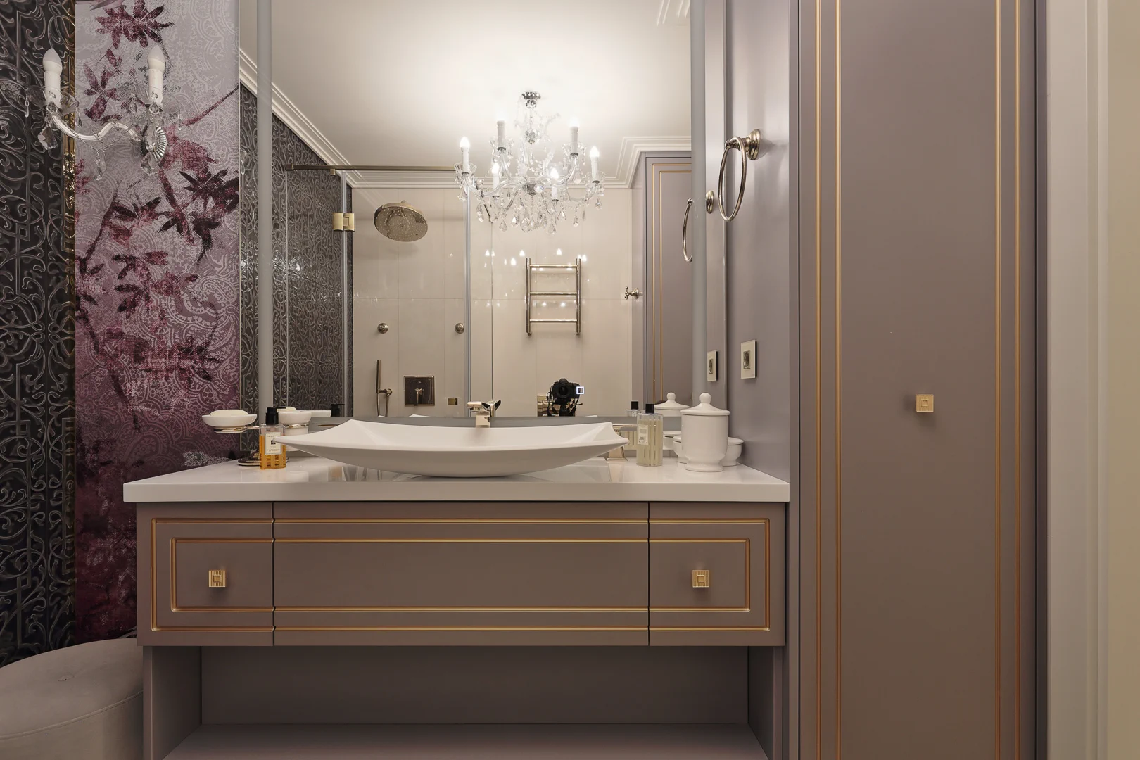 Почти все интерьерные элементы были выполнены компанией Lumi по дизайнерским эскизам. Это и великолепная кухня с островом и потайной кладовой, и гардеробная со множеством приспособлений для хранения вещей, и стеновые панели в гостиной и спальне, все встроенные шкафы и комоды, мебель для ванной комнаты.
