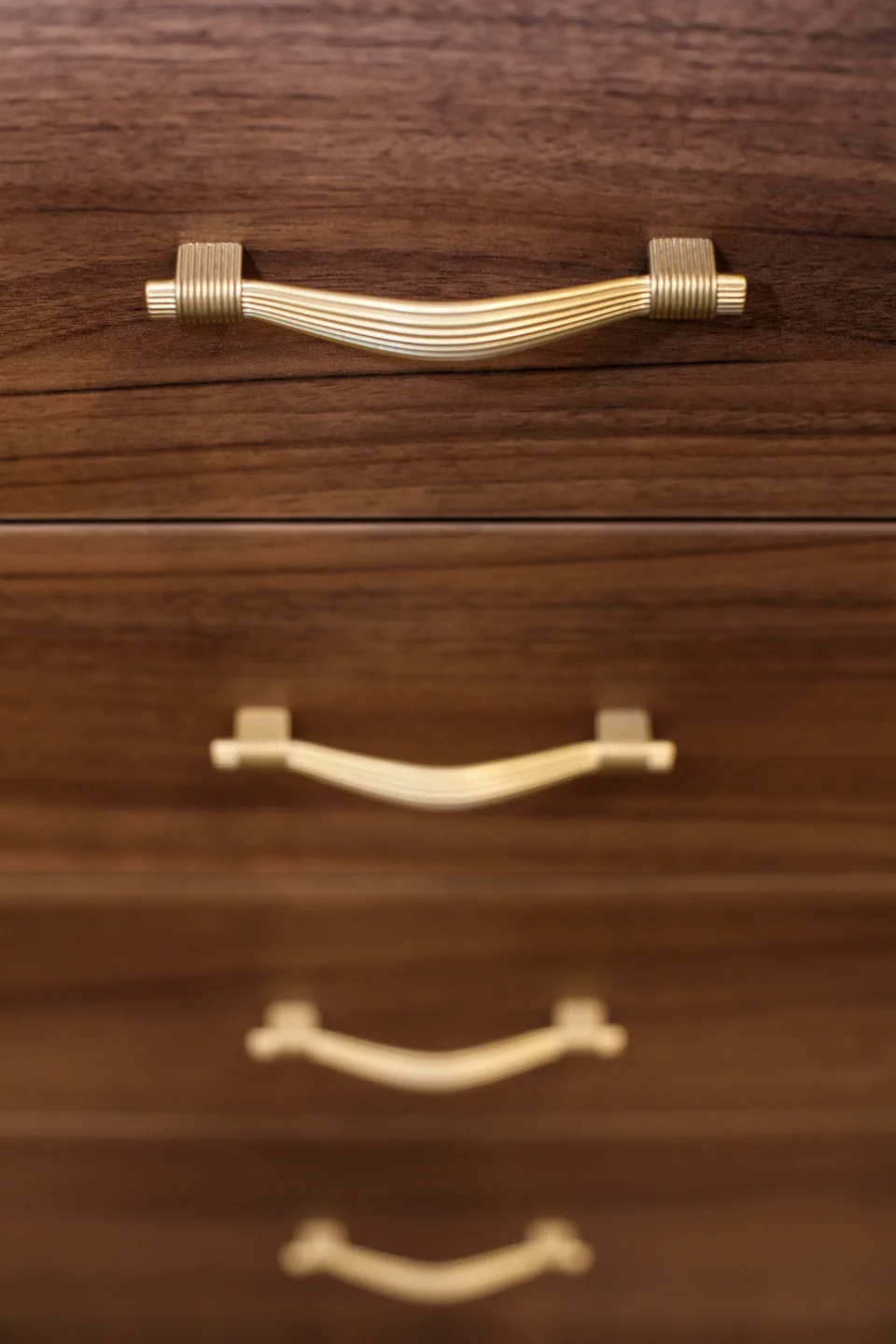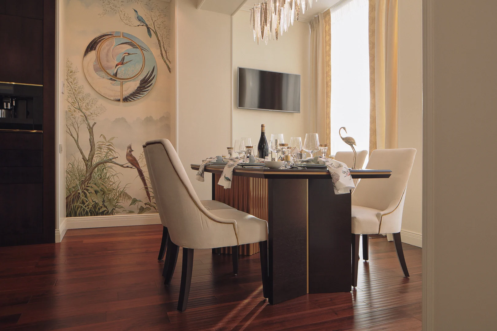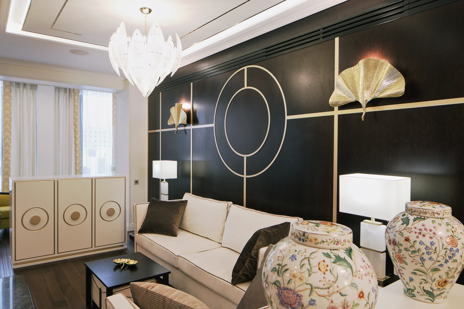 Стиль интерьера — современная вариация ар-деко, в основу которой легла геометрия круга, вписанного в квадрат. Этот пластический мотив встречается в отделке фасадов, стеновых панелей и раздвижных дверей, в декоре мебели. Палитра интерьера сдержанно-контрастная — темные тона венге и светлые кремовые оттенки лака. Добавляют роскоши латунные детали, позолоченный декор, благородные натуральные фактуры дерева и камня.
